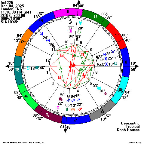 The Sun today is at 9 degrees Sagittarius. Venus and Mars are also in Sagittarius. 'Tis the season to be jolly. Saturn and Neptune are in Pisces. Their unconsummated 'test of faith' conjunction, dominating most of 2025, was closest on July 14th and is exactly conjunct on Feb 20th 2026, currently the pair are in Pisces, revisiting old issues, but now Saturn is direct in motion, so the aspect is tightening. There are 21 days to the Northern Hemisphere Winter Solstice.